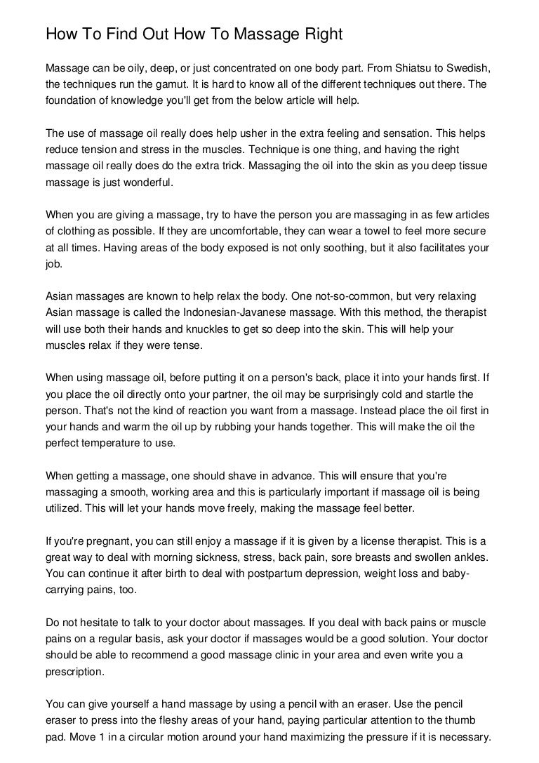 Massage is thought to stimulate uterine contraction, possibly through stimulation of local these investigated the effects of uterine massage after birth, before and/or after delivery of the placenta for the modifications to the recommendation, where necessary, should be justified in an explicit and. Massage is a popular treatment for tough, common pain problems like low back pain, neck pain, and headaches — but can it provide. Postpartum massage is beneficial for moms following the birth of their babies.
